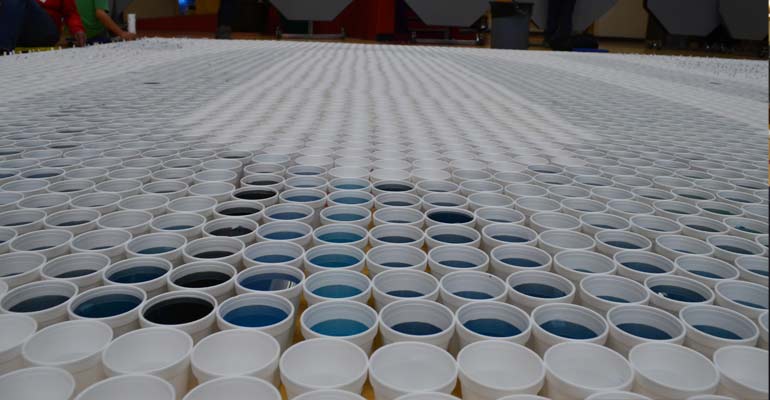 What do you think would happen if you gave me a heck of a lot of cups (10,000 to be exact), 1,500 liters of water and some blue dye? Something impressive of course! This really was no easy task though. Not only did I have to design it myself but I had to recruit 40 volunteers who in total contributed over 500 hours of their time to to help plan and assemble it. Every single cup had its own coordinate and had to be pre-labeled so that we knew where it should go and what color of water should be in it. It was quite fun and stressful at the same time.